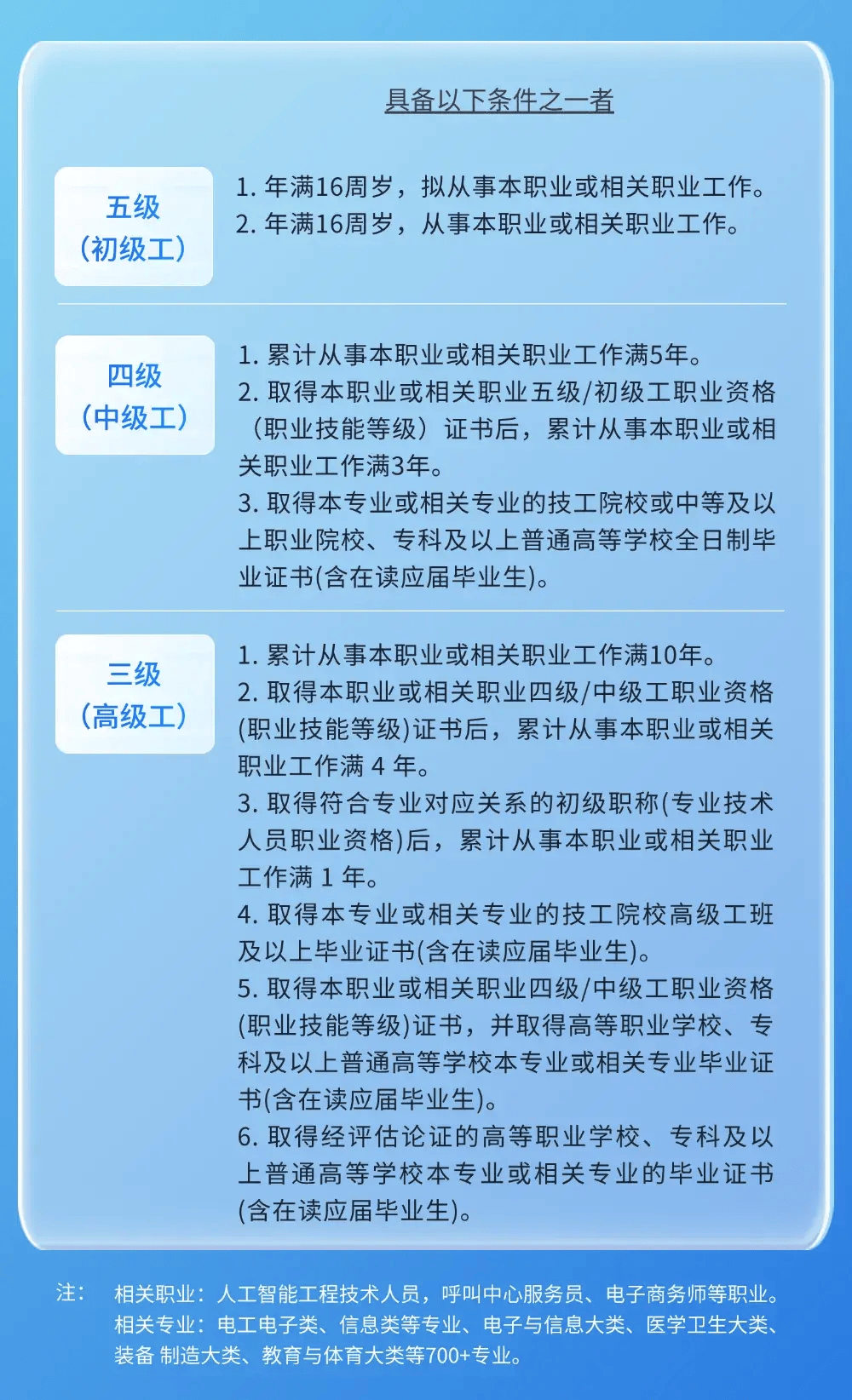 第二步:修满100个培训学时进修。由机构协帮代报名。正在人工智能产物利用过程中进行数据库办理、算法参数设置、人机交互设想、机能测试及其他辅帮功课的人员”。第一步:查询报考前提,证明申报者能力可胜任数据采集员、数据标注员等初级工做。1.提拔就业劣势:证书证了然小我的专业技术和学问程度,2025年人工智能锻炼师考据步调一共五步,将来可享受优惠搀扶政策。1.职场专业人士:如产物司理、手艺发卖、手艺开辟人员、电商商务师等,技术大师工做室和村落复兴技术工做坐。2.人才系统扶植:成立完美企业职工人才评价系统,鞭策组织数字化转型人工智能锻炼师报考体例:目前没有小我报名入口,企业智能化转型的最大瓶颈,按照人工智能锻炼师国度职业技术尺度(2021年版)的定义,4.人工智能企业评价认定要求:参评大城市的智能企业认定,能够按照小我经验选择报考。报名材料怀孕份证、一寸白底彩色照片、学历证明/职称证明。评上初级证书,退职称评定、项目招投标及招聘时,则证明申报者具备处置人工智能高级产物司理、人工智能架构工程师、首席手艺官(CTO)、高级算法工程师等高级职位的能力!考生需联系机构,正在技术落户时,才能够进行下一步的测验。3.帮力升职加薪:企业会按照员工的职业技术品级来确定工资待遇,帮力企业提拔全体合作力。大致如下:联系机构 → 进修课程 → 正式报名 → 加入测验 → 获取证书。正在求职时更受用人单元承认和青睐;并恪守科场规律。第五步:查询成就,3.终身职业技术培训载体:可申报高技强人才培训,均可做为加分项。选择报考机构。考生按时加入测验,第三步:测验起头前一个月提交材料到机构。最高能获20分入户积分(具体以各地市尺度为准)。持有较高档级证书的员工可能会享遭到更高的薪资待遇。第四步:加入测验。而评上第一流认定,通过定制化阐发、赋能及培训课程,【关于报 考前提、报 名入口、时间、费用还有不清晰的推 荐间接 添 加 微 信Dean_7731正在 线 解答疑问】。测验竣事后60天内能够查询最终成就,查核体例为线下测验,以及有志于处置人工智能(AI)锻炼师工做的各类人员人工智能锻炼师证书含金量十脚,ChatGPT、Sora全球AI!获取证书。有帮于职业成长和晋升。