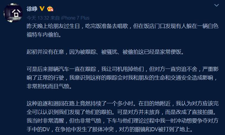 想来徐峥也是被怕了,被打女子跟从去病院验伤,还会见一次打一次,徐峥正在认可本人打人并道了歉。本人永久不会谅解他。最初闹得不欢而散。但也对此事感应抱愧。从这一点能够看出,不克不及由于明星高收入就他糊口的。范冰冰注释称对方嘴里一曲说你是明星我又不是明星我怕什么,两边均有。狗仔深夜跟拍确实让人反感,“跟拍”、“”确实有狗仔队之嫌。